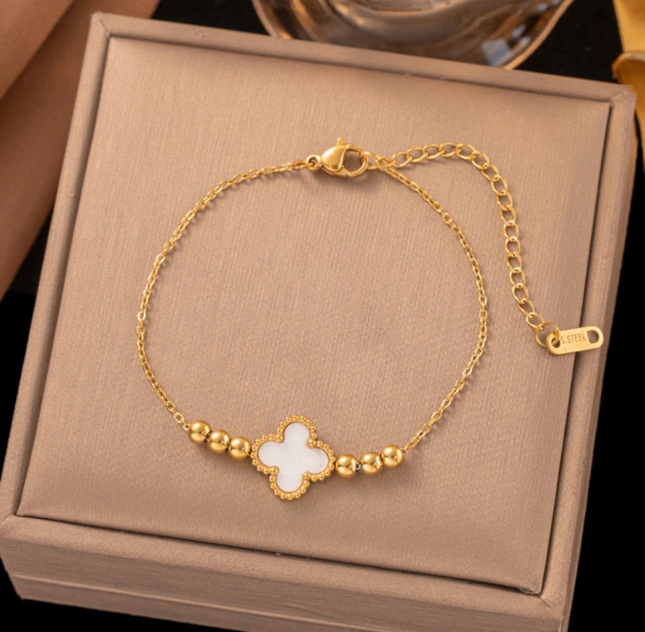 Be the first to review “Gold plated stainless steel anti tarnish white clover themed wraparound bracelet”