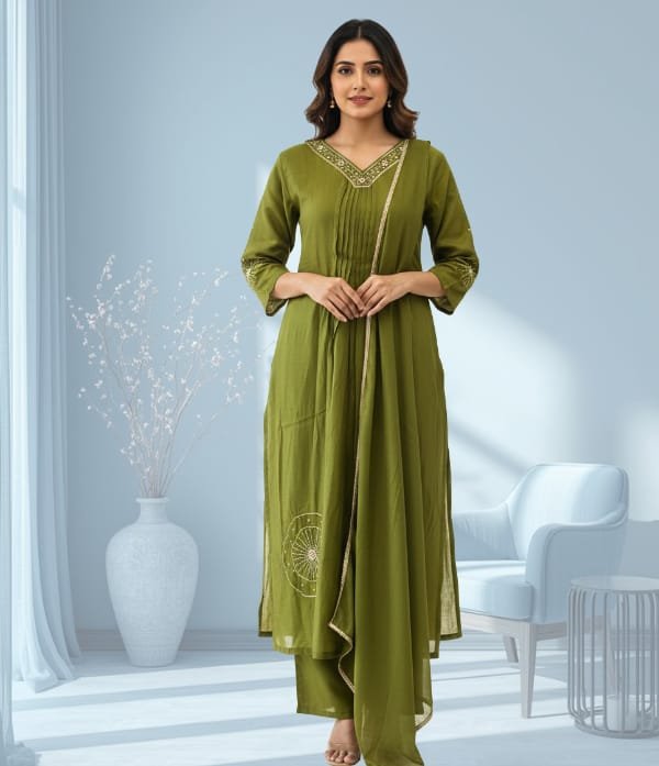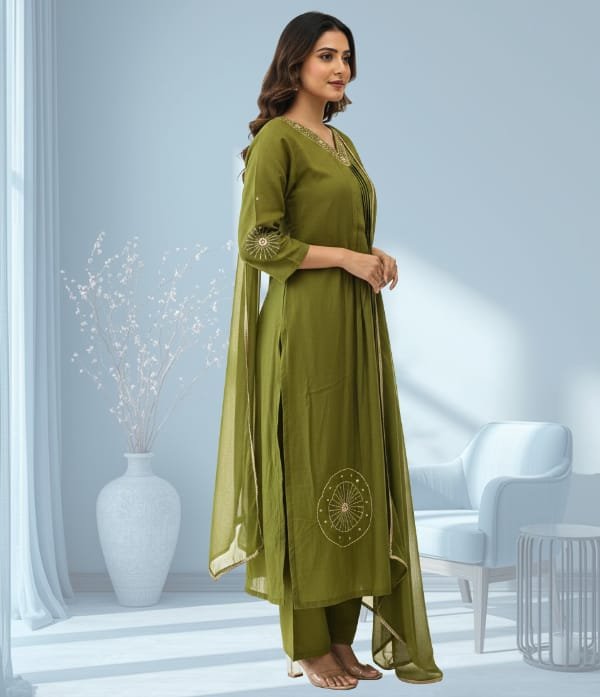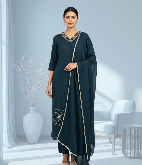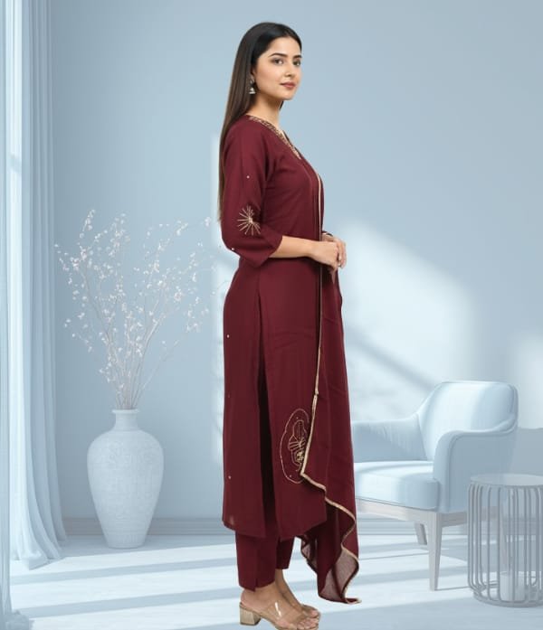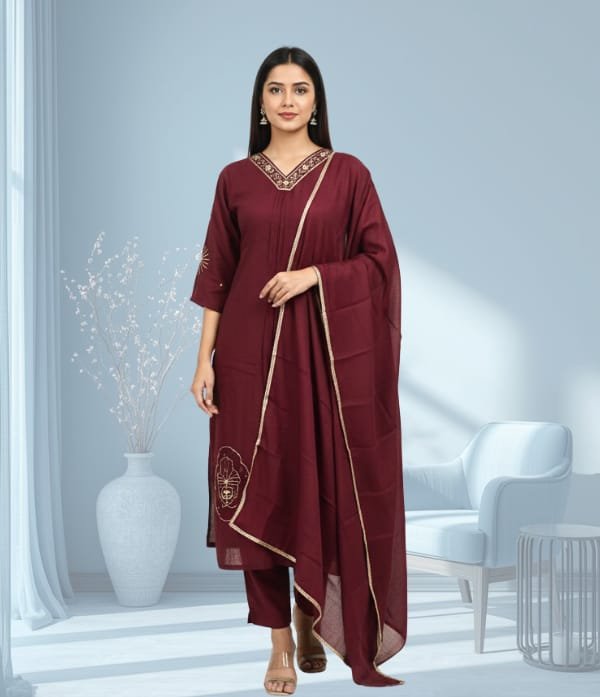Carefully tailored for a graceful silhouette, the set includes a stylish kurta adorned with detailed bead work, a comfortable churidar bottom, and a matching dupatta to complete the look. The premium-quality fabric ensures both comfort and durability, making it perfect for long celebrations.
