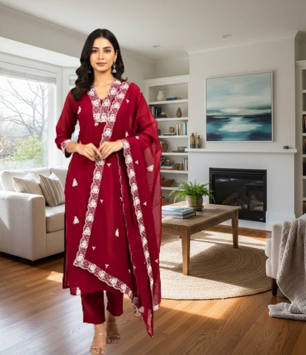 The rich thread work adds depth and texture to the outfit, creating a graceful and sophisticated look. The set includes a well-tailored kurta, matching churidar bottom, and a coordinated dupatta to complete the ensemble. Crafted from quality fabric for comfort and style, this churidar set is perfect for festive occasions, family gatherings, and cultural celebrations.