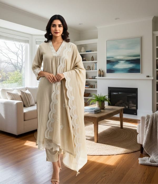 Made from comfortable, soft-touch fabric, the kurta features detailed thread work that enhances its traditional appeal. The set includes a perfectly tailored churidar bottom and a matching dupatta, creating a complete and sophisticated ethnic ensemble.